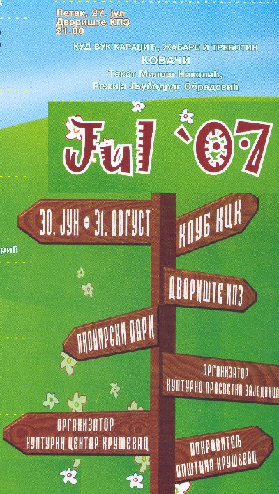 27.jula 2007. godine u dvorištu KPZ Kruševac, u okviru LETA KULTURE 2007, koje zajednički organizuju Kulturni Centar Kruševac i KPZ Kruševac, izvedena je predstava KUD-a *Vuk Karadžić iz Trebotina, Žabara i Male Vrbnice, KOVAČI po tekstu Miloša Nikolića, a u režiji Ljubodraga Obradovića. Publika je sa uživanjem pratila predstavu i na kraju ovacijama glumce pozvala na bis.